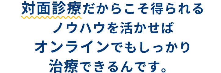 オンライン診療だけを行っていたわけではなく、対面治療を通して患者様と向き合ってきたからこそ、オンライン診療でも症状にあわせた治療が行えるのです。また、コロナ禍における法規制緩和により、現在では初診からオンライン診療が受けられます。
