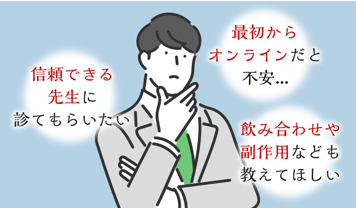 診察を行い、症状に合わせた薬を処方してくれるクリニックに通うのがおすすめです。ただし、薬には少なからず副作用があります。万が一の際、すぐに対応してもらえるように対面診療に対応したクリニックを探しましょう。
